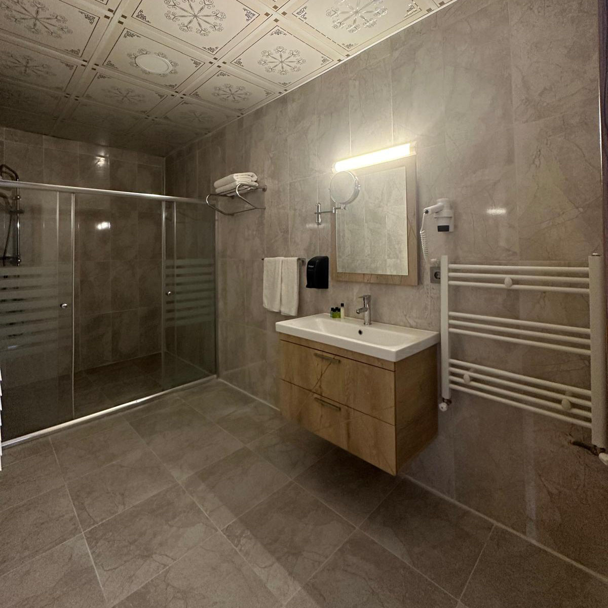 Çay-kahve seti, havlu takımı, banyo malzemeleri odada hazırdır.